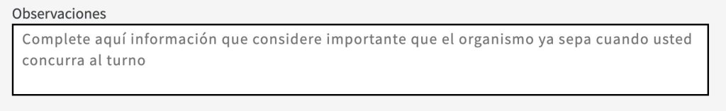 Cuando se avanza en el sistema de turnos, se accederá a otro campo que si bien para el sistema resulta ser de carácter «optativo», es sumamente importante que sea completado. Se trata del campo «Observaciones»: