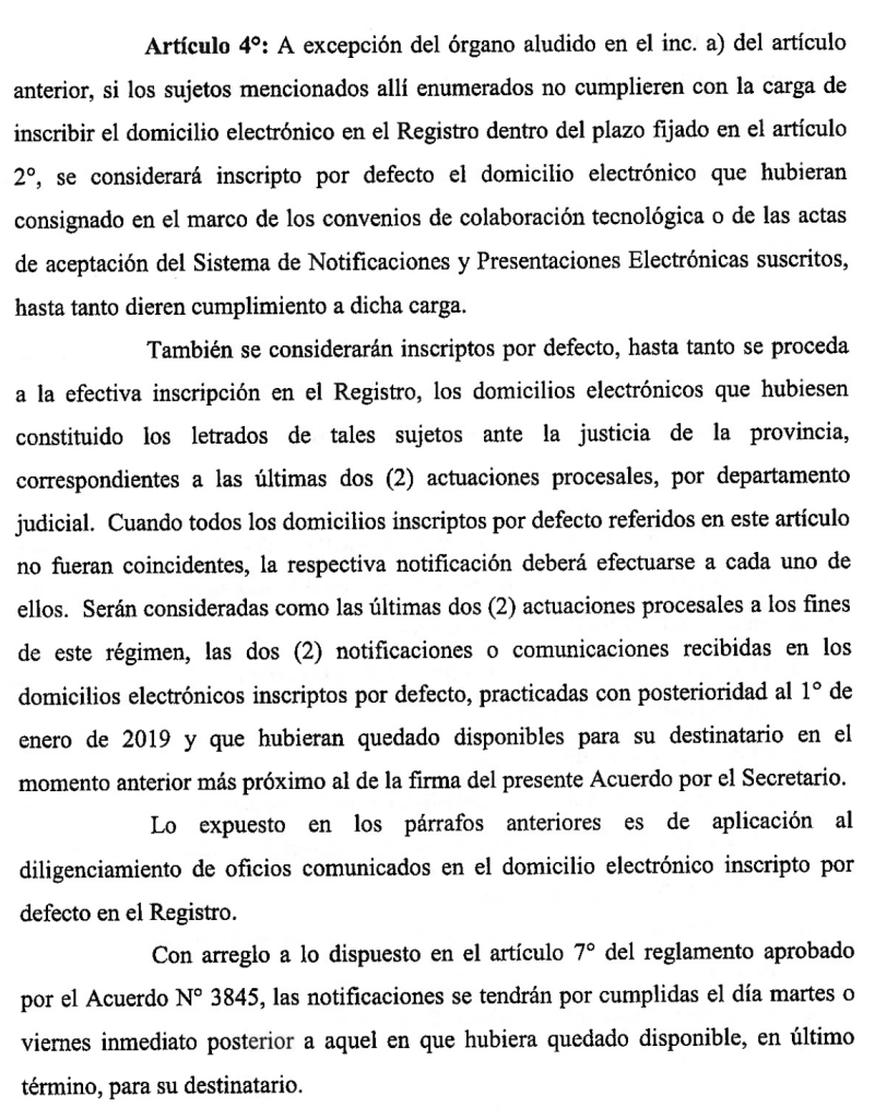 El uso de esos domicilios será procedente «en tanto no se hubiere constituido otro domicilio electrónico en el proceso, en cuyo caso prevalecerá». La notificación se tendrá por cumplida el día martes o viernes inmediato posterior a aquel en que hubiera quedado disponible (conf. Ac. SCBA 3845/17)