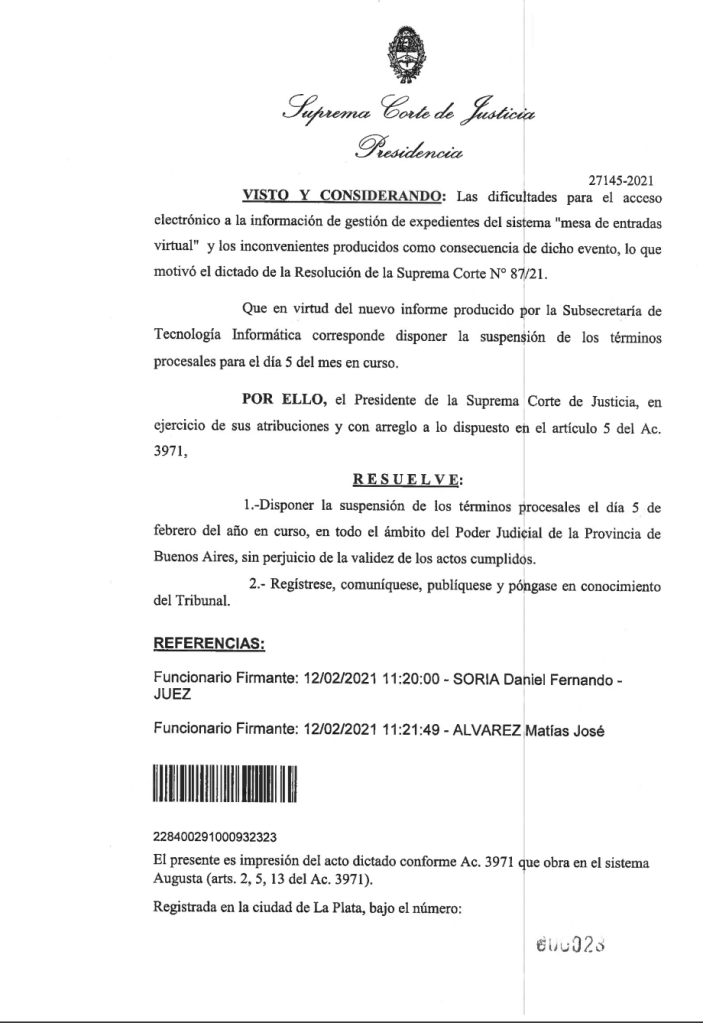 Comunicamos que la SCBA dispuso suspender los términos procesales en todo el ámbito del Poder Judicial de la Provincia de Buenos Aires para el día 5 de febrero de 2021, con motivo de la indisponibilidad del servicio de la Mesa de Entradas Virtual.